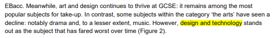 The second extract is interesting. Whilst outlining the potential uptake of subjects at KS4 in the context of Ebacc, the extract states that D&T appears an outlier compared to other optional subjects, in relation to entries. How to interpret this is purely personal, but it could indicate that there is more than just “the Ebacc” at play with the decline of GCSE qualification entries. Many argue that the Ebacc is the blame, and I understand that position. However in contrast Art and Design is a subject that continues to, quote, “thrive” according to the report. Further to this extract, the report goes on to suggest that the take-up of technical equivalent courses, in this case one would assume to be referring to vocational Engineering, should be accounted for in the decline (of D&T?), and whilst Engineering is not named, the report groups “arts qualifications” together and infers that take-up of these qualifications at KS4, for which D&T is one, is potentially more stable. National entries might disagree with this position, but this could infer a position for this report that D&T is not in trouble when bundled up within a suite of technical subjects. But I digress…