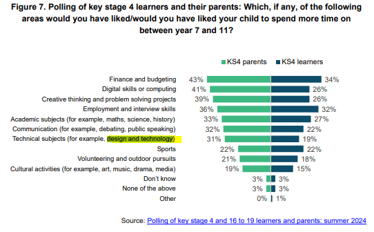 The third extract is equally interesting. When polling KS4 students and their parents, 31% of students and 19% of parents would have liked (their child) to have spent more time on technical subjects between years 7 and 11. Design and Technology is listed as a technical subject here (not arts as was previously referenced in the report). This would suggest that 1 in 5 parents would have liked more of subjects like D&T (assume other technical subjects like engineering are also part of this desire) between year 7 and 11, but not specifically/soley in GCSE D&T (which would have been a nice question to ask) and nearly 1 in 3 students would have liked to have more D&T (or engineering) between year 7 and 11, but again not presuming just GCSE D&T.