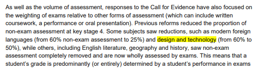 Our fourth and final extract is in the context of volume of assessment, where the report plays back an existing fact to us as the reader, which is that GCSE D&T previously had a different balance of assessment, which was 60% coursework and 40% written examination (or as I call it, the good old days). It further states that this previous balance would have seen less reliance on the terminal examination for a students final grade, with more assessment value attributed to a student’s performance at different points across the course. This is nothing insightful, purely factual. There is a little negative comment linked to this section also, which is that some responses to the interim report felt that terminal written examination “may not give students the opportunity to fully demonstrate their capabilities”. This infers that coursework might be a better assessment method to help students demonstrate their capabilities in D&T, though we do not have this comparison data to hand of course.