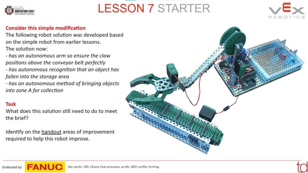 Working closely with the Fanuc team in Coventry on a project to create a 12-week learning program for secondary school students. This program will teach students about production line design and programming using the VEX EDR robotics platform.